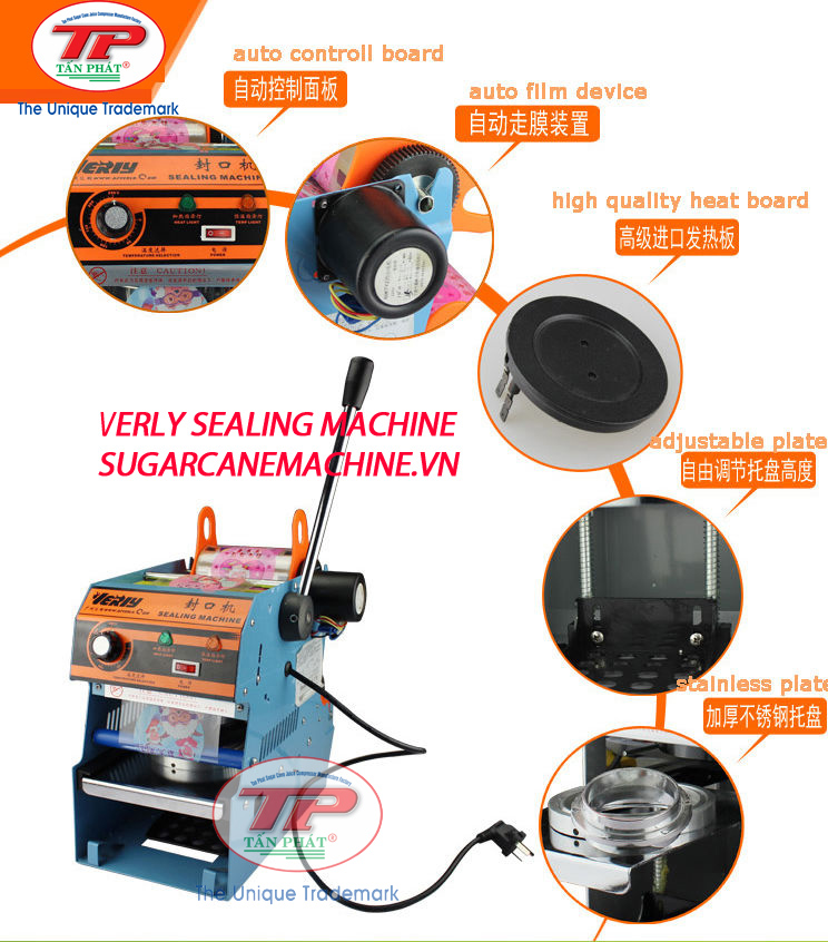 The automatic cups seal machine suitable use in sugar cane juice shop, coffee , ..etc Automatic injection molding and coils Type : Automatic - Model : ETON Q7 - Power : 350W - Volatge : 220V - Size : 390x310x550cm - Weight : 24kgs - Capacity : 300-500 cups/H - Types cups : 180ml / 450ml/500ml/700ml/750ml