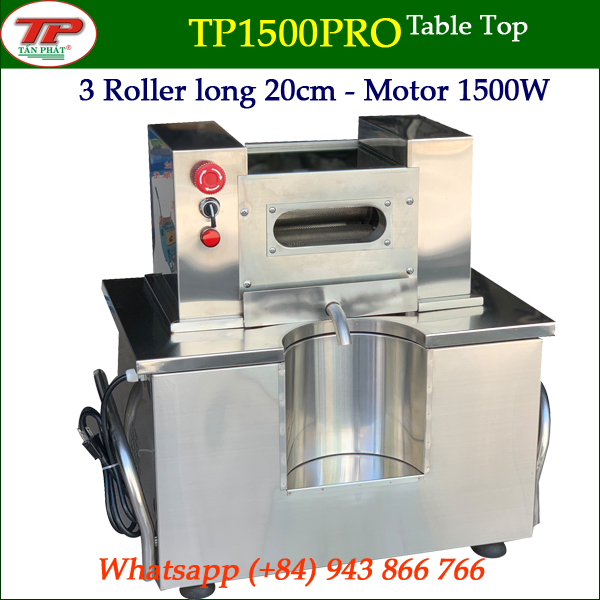 TP1500PRO sugarcane juicer machine - table top is one of the options for heavy use such as used in churches, shopping malls, bottled sugarcane juice,.... etc TP1500PRO suagrcane machine designed 3 diamond stainless steel roller - strong - 20cm long roller and 1500W motor so it can operate with multiple sugarcane at the same time without fear of being stopped.